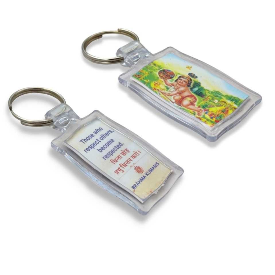 Brahma Kumaris Shri Krishna Plastic Key Ring with Divine Thought on it.